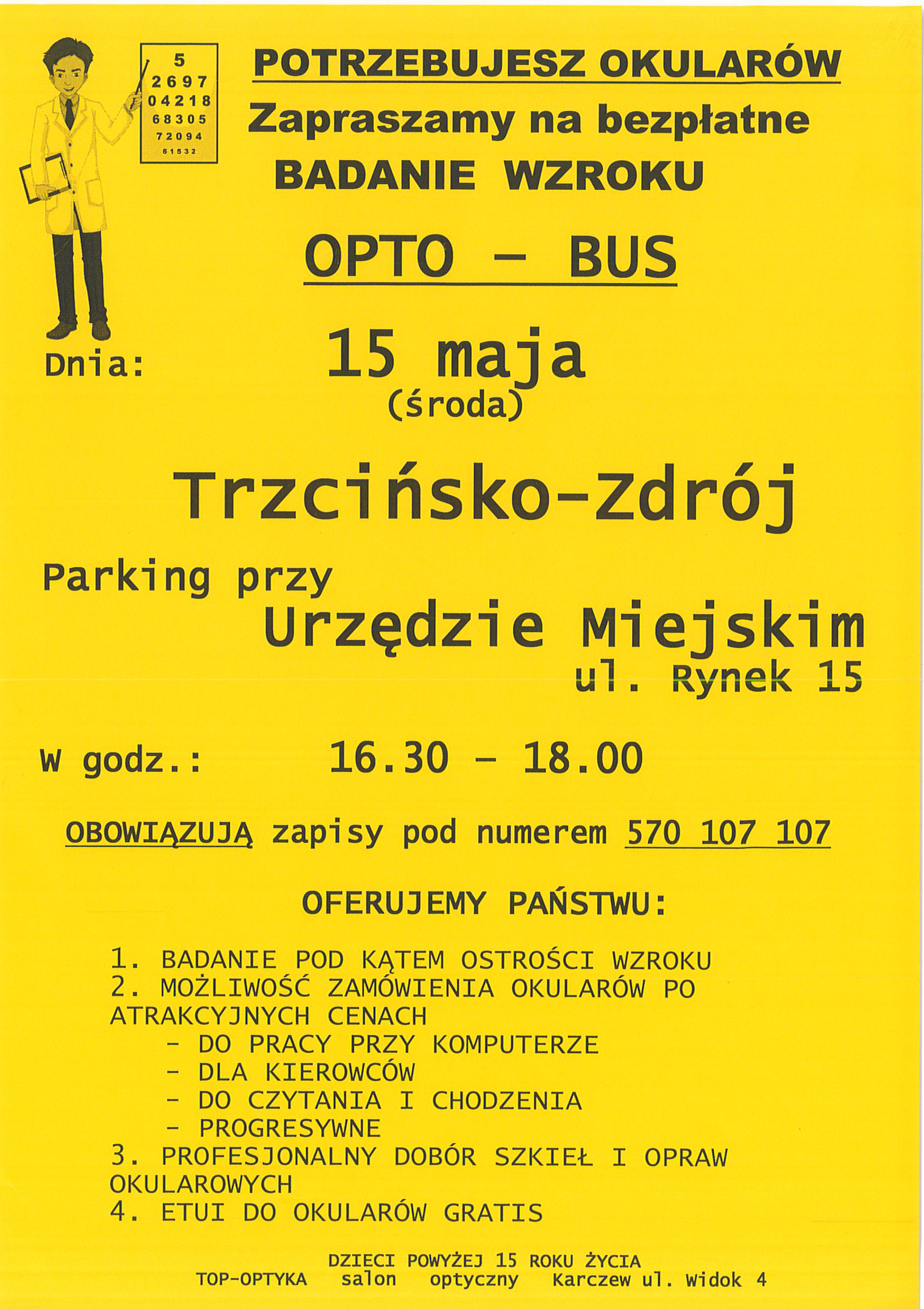Serdecznie zaprasza na bezpłatne badanie wzroku w dniu 15 maja 2024 r. (środa) na parkingu przy Urzędzie Miejskim ul. Rynek 15, w Trzcińsku-Zdroju w godz. 16:30-18:00 - pojazd OPTO-BUS.