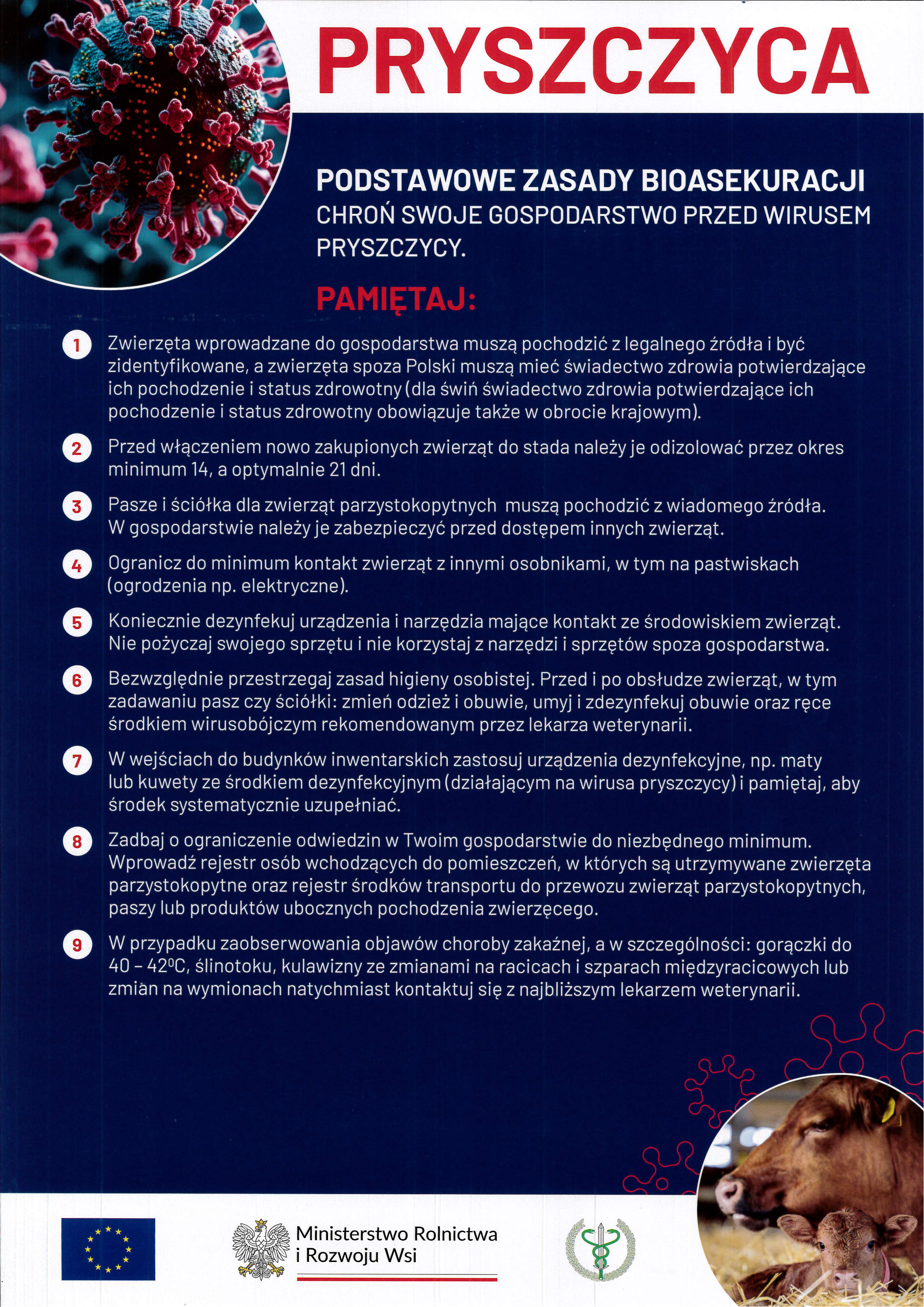Wraz z przewodnikiem opublikowano również plakat informacyjny dotyczący pryszczycy – wysoce zakaźnej choroby wirusowej, która może powodować poważne straty ekonomiczne w hodowli zwierząt. Materiały mają pomóc właścicielom gospodarstw w szybkim rozpoznawaniu objawów choroby oraz podejmowaniu odpowiednich kroków w razie jej podejrzenia.